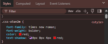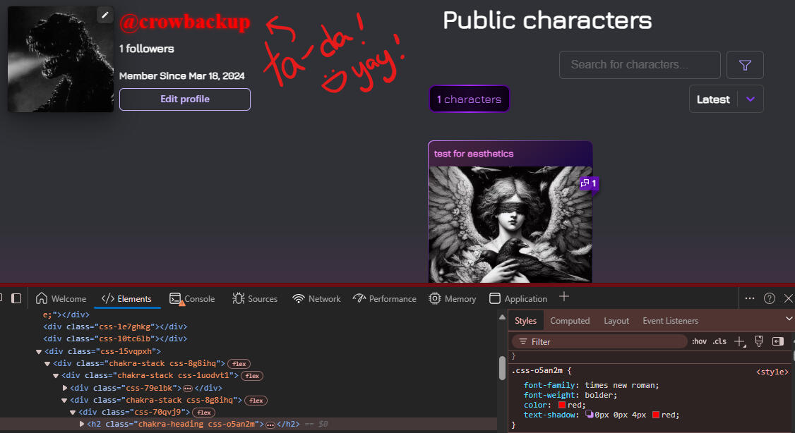 Fun fact! See that menu in the bottom right hand corner where the class is located? You can test your adjustments there to see what they look like, and you can just copy paste! For example… Let’s say I want my username to be the color red, be in the font “Times New Roman,” make it bold, and.. oh, let’s give it a cool glow effect!